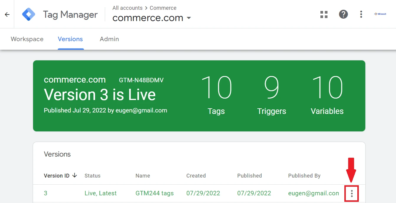 Click on your container to open it. In the address bar of your browser, look at the URL of the current page - it contains the GTM Account ID. Find the ID number after accounts and write it down - you will paste it into your store.