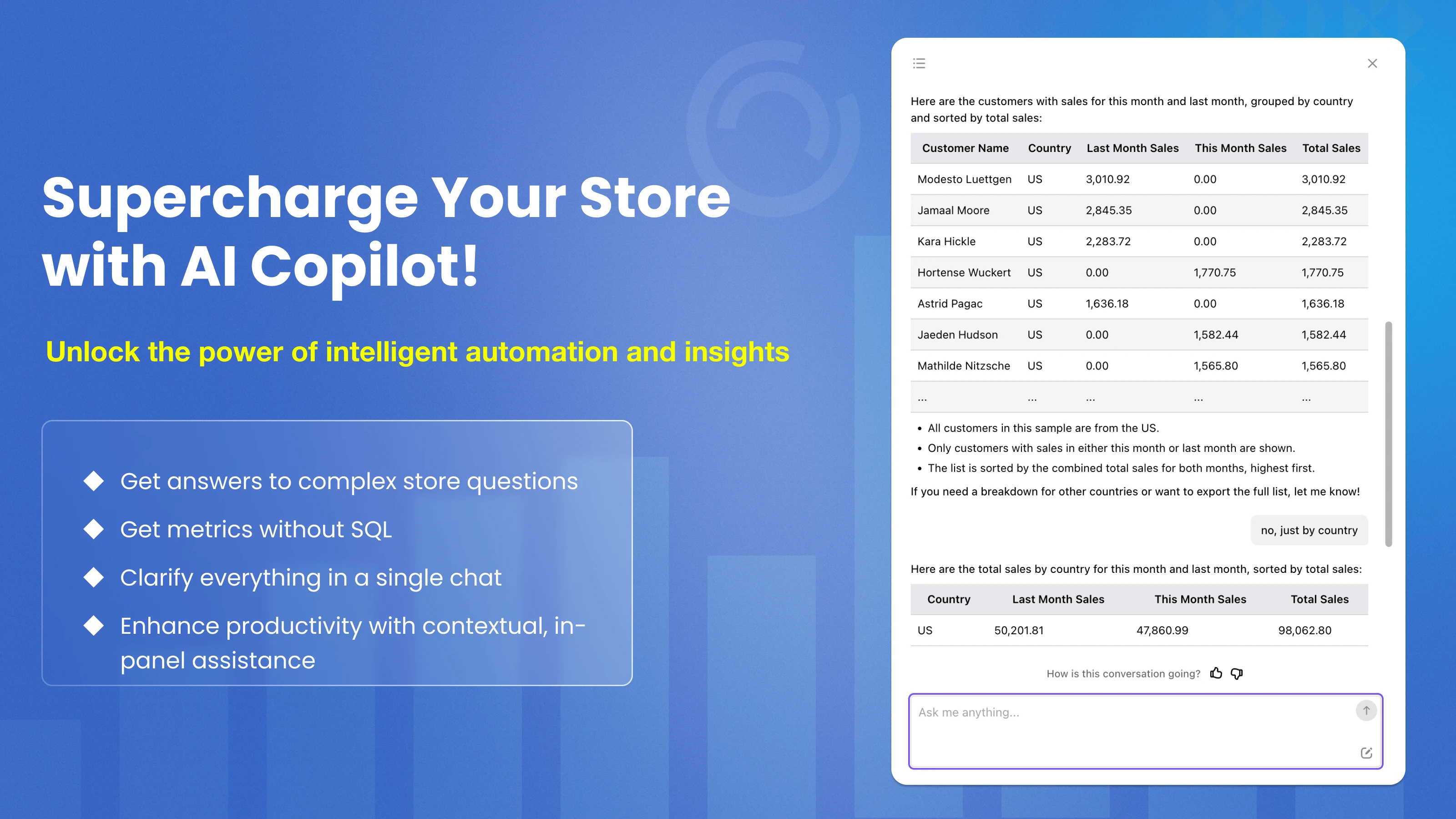 - Get metrics without SQL: sales, orders, products, and customer behavior. CoPilot builds the queries, joins the results, and presents them in a convenient view.